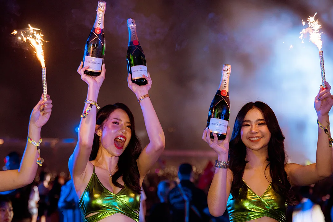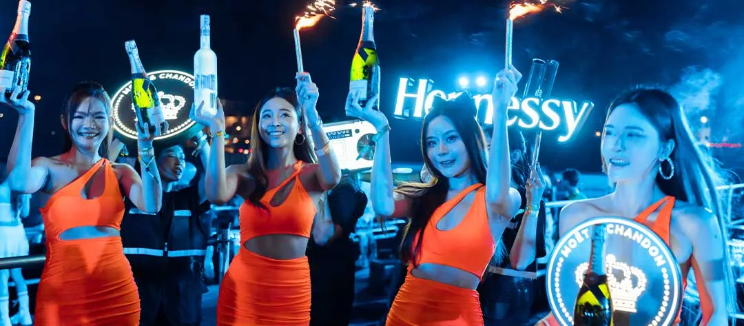 Enjoy an exclusive private entrance at our dedicated Bottle Service check-in tent, followed by golf cart transport to your table.